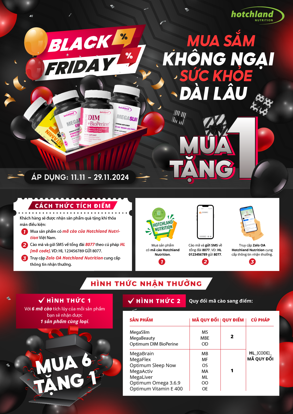 Hotchland Nutrition hân hạnh mang đến chương trình ưu đãi đặc biệt MUA 1 TẶNG 1 cho các sản phẩm chọn lọc nhân dịp Black Friday năm nay. Đây là cơ hội tuyệt vời để bạn đầu tư vào sức khỏe bản thân và gia đình với các sản phẩm chất lượng, kết hợp công nghệ tiên tiến và thành phần thiên nhiên.