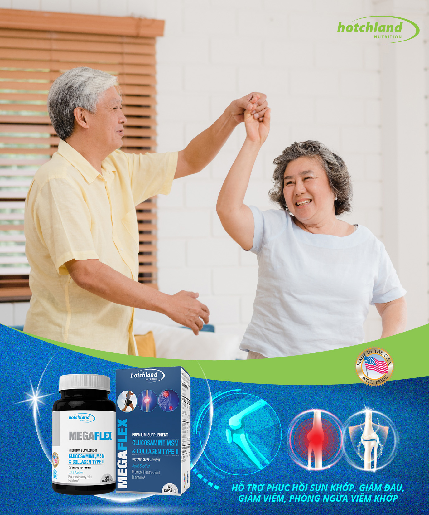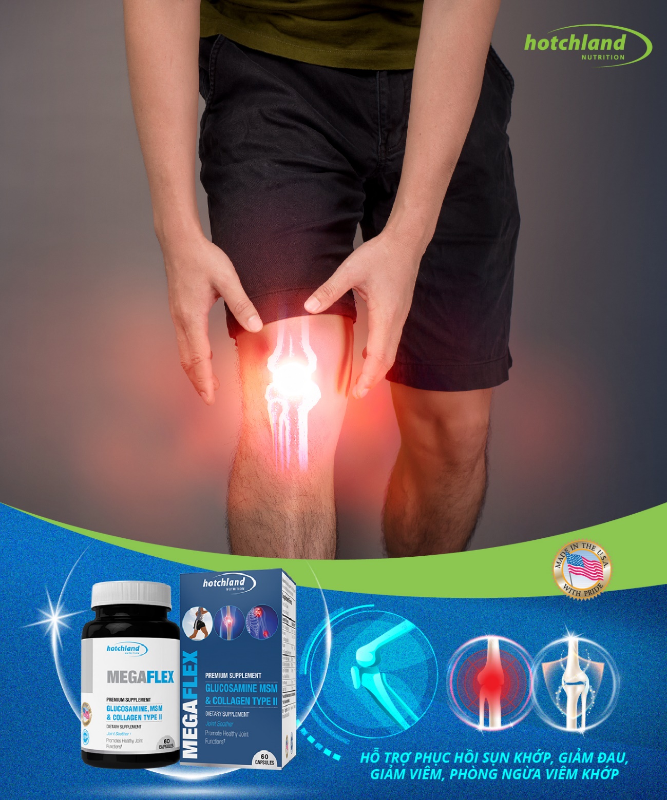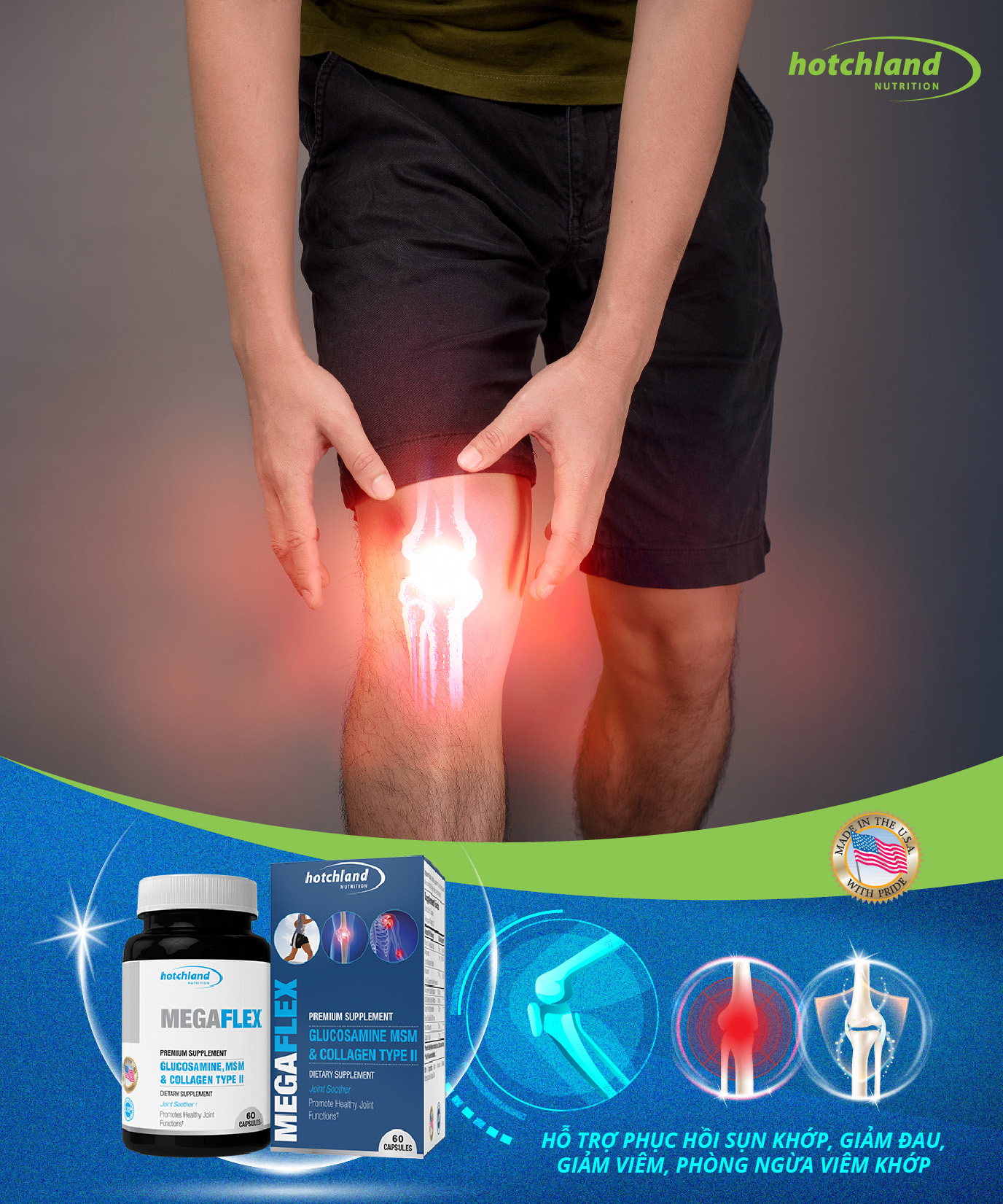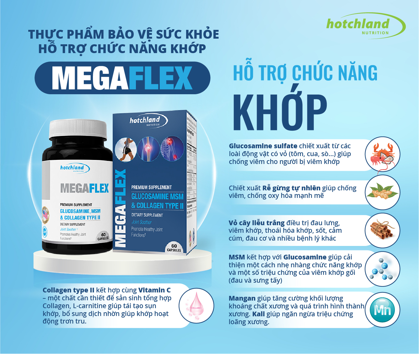 Bạn hoàn toàn có thể tìm thấy những dưỡng chất thiết yếu hỗ trợ xương khớp trong Thực phẩm bảo vệ sức khỏeMega Flexcủa Hotchland Nutrition. Sản phẩm hỗ trợ chăm sóc sức khỏe xương khớp toàn diện đến từ Mỹ. Mega Flex có công dụng hỗ trợ giúp giảm viêm, sưng và đau nhức xương khớp,hỗ trợ quá trình tái tạo và phục hồi mô xương, sụn và khớp.