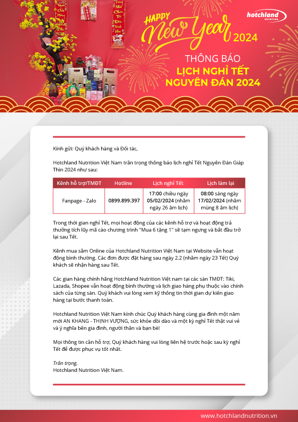 Hotchland Nutrition Việt Nam xin kính gửi Quý Khách hàng cùng Quý Đối tác, thông báo lịch nghỉ Tết Nguyên Đán Giáp Thìn 2024