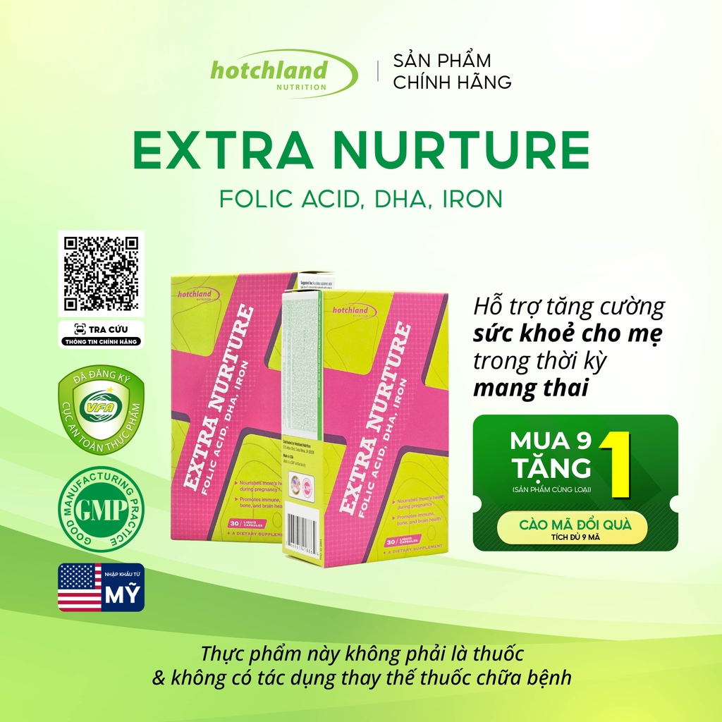 Viên uống Hotchland Extra Nurture Folic Acid, DHA, Iron là thực phẩm bảo vệ sức khỏe được nhập khẩu từ Hoa Kỳ, hỗ trợ tăng cường sức khỏe cho mẹ trong thời kỳ mang thai. Sản phẩm bổ sung các vi chất thiết yếu như acid folic, DHA, sắt, vitamin D, iod, canxi, kẽm và nhóm vitamin B, giúp mẹ bầu được cung cấp đầy đủ dinh dưỡng theo nhu cầu tăng cao trong thai kỳ.